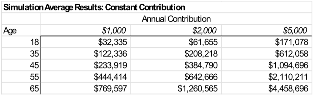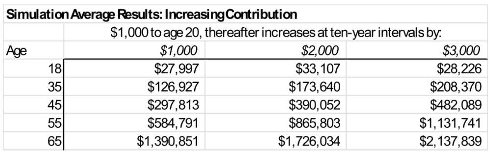 To show the potential of Trump Accounts for lifetime wealth building, I set up a spreadsheet simulation to model potential investment results. I assume investing strictly in an S&P 500 index fund, and I maintain the same annual contribution level for the life of the account holder. For each yearly contribution amount, I ran 100 trials, applying a rate of return drawn at random from historical S&P 500 data: with an average annual real (adjusted for inflation) portfolio return of 6 percent (reinvesting dividends), and standard deviation of 20 percent.